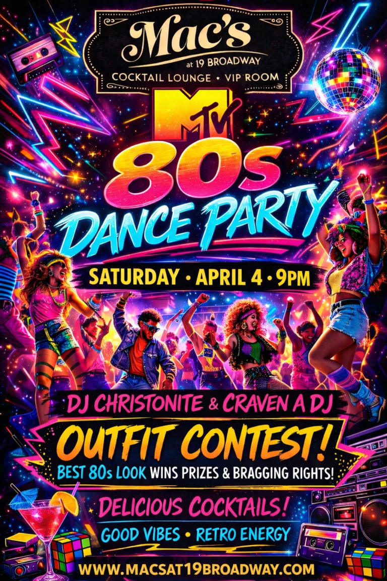 Relive the golden era of MTV with a night of nonstop throwback hits, vibrant retro vibes, and an unforgettable dance floor at Mac’s. Dress to impress for the 80s outfit contest and party like it’s 1985.