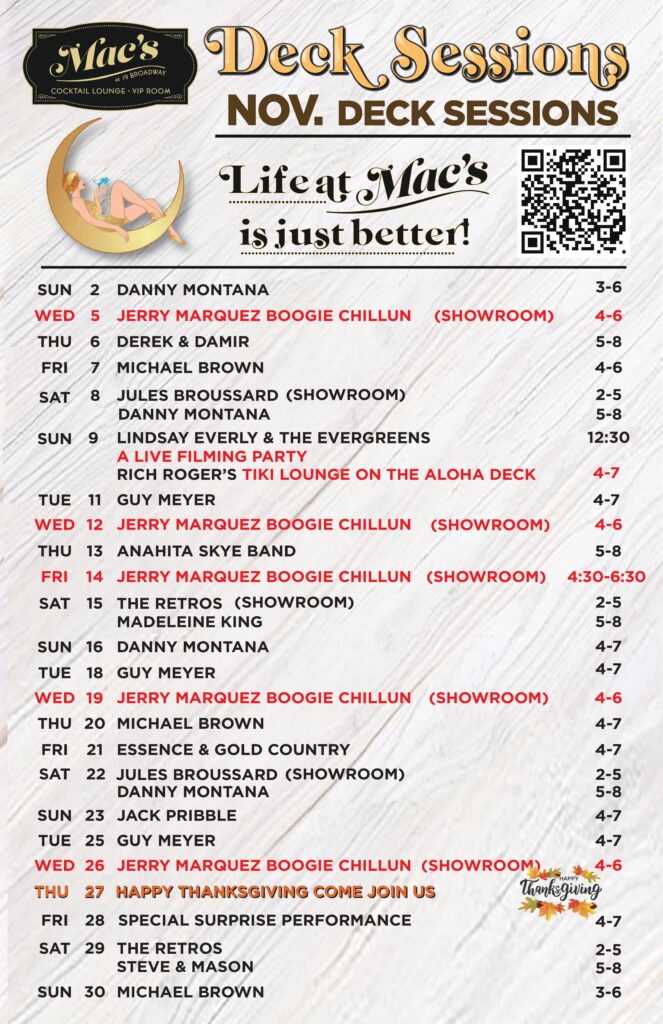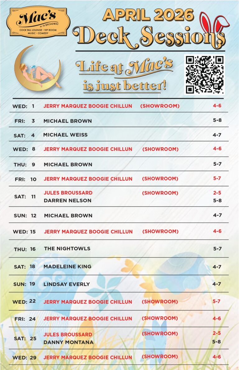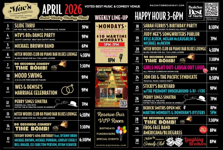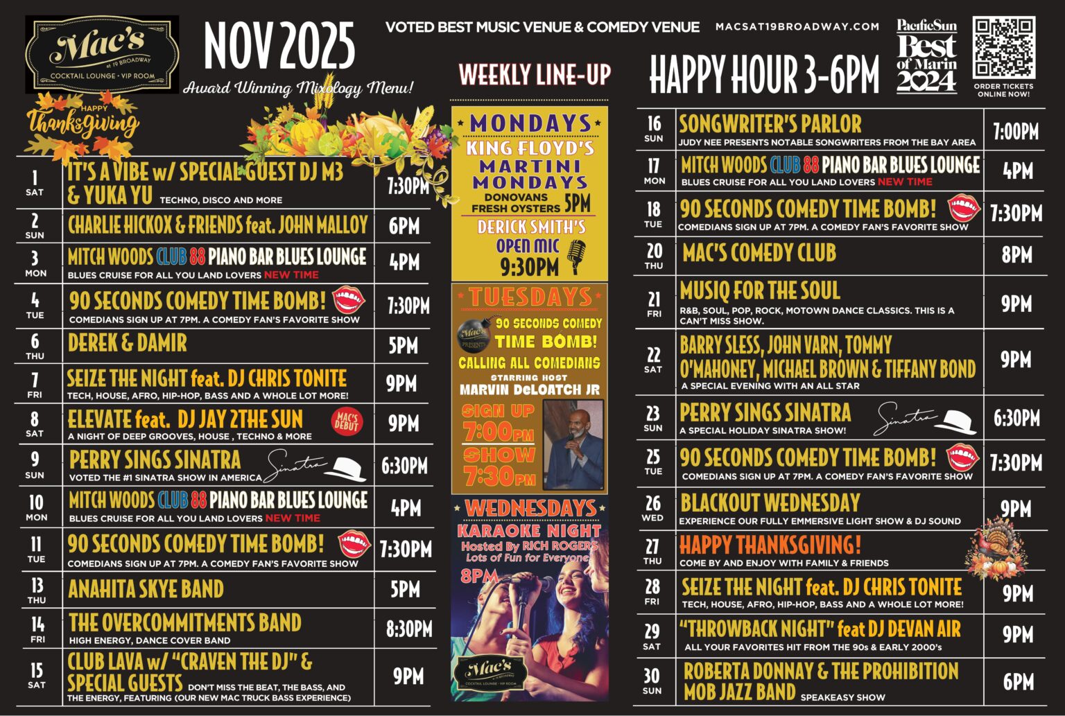 Stay in the loop with everything happening at Mac’s — from comedy nights and deck sessions to special community events. Check out our calendar below and save your spot for the next big night in Fairfax.